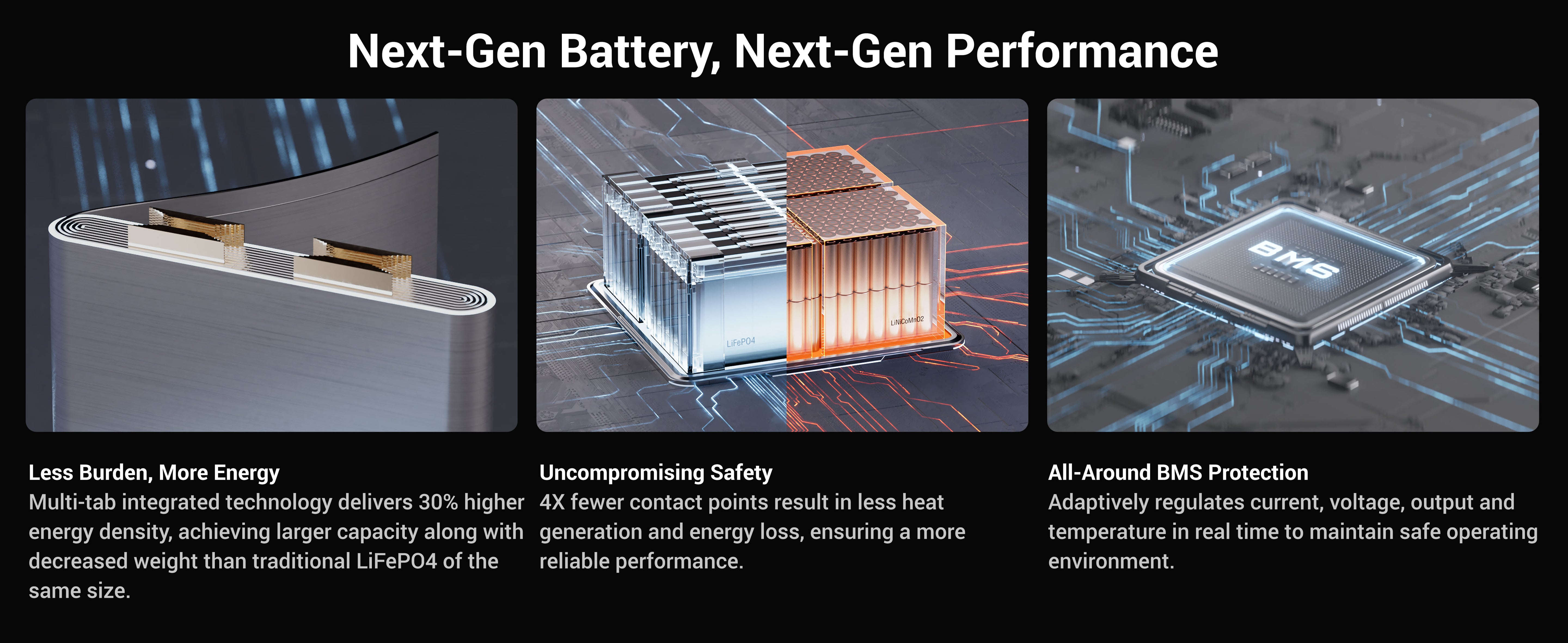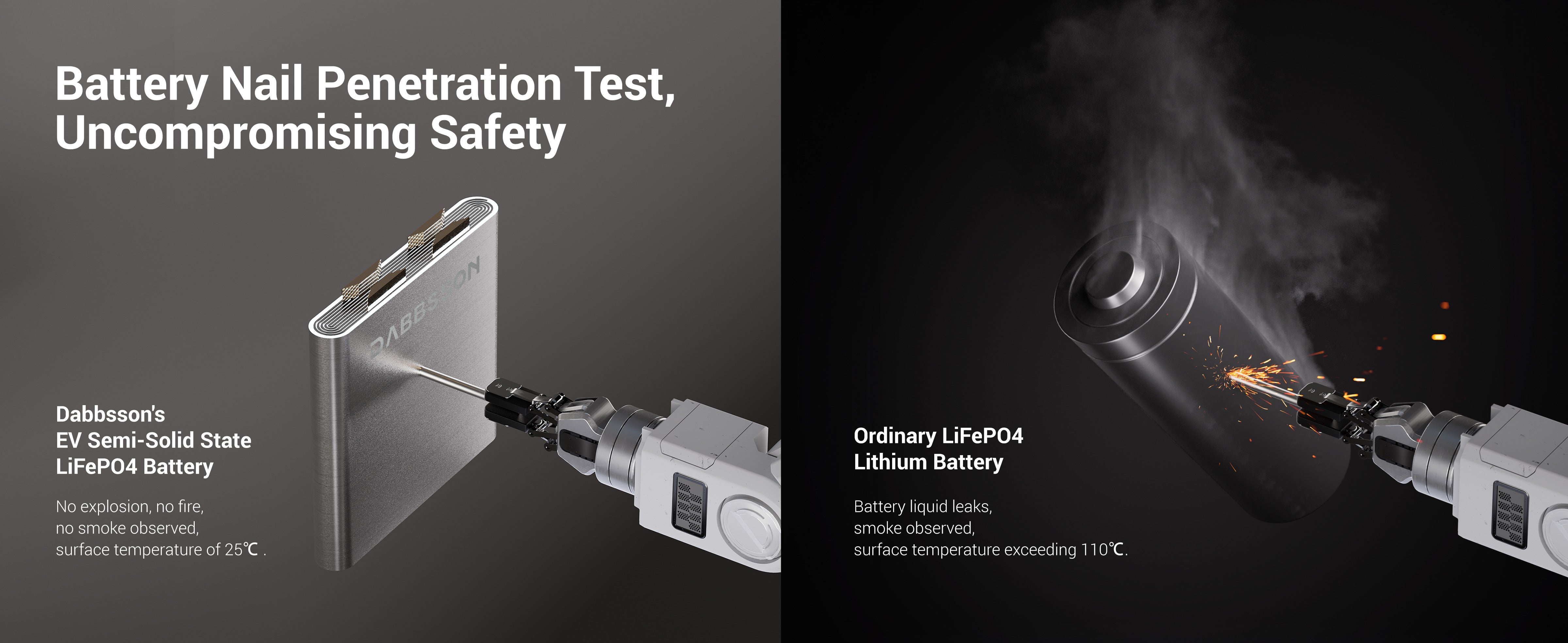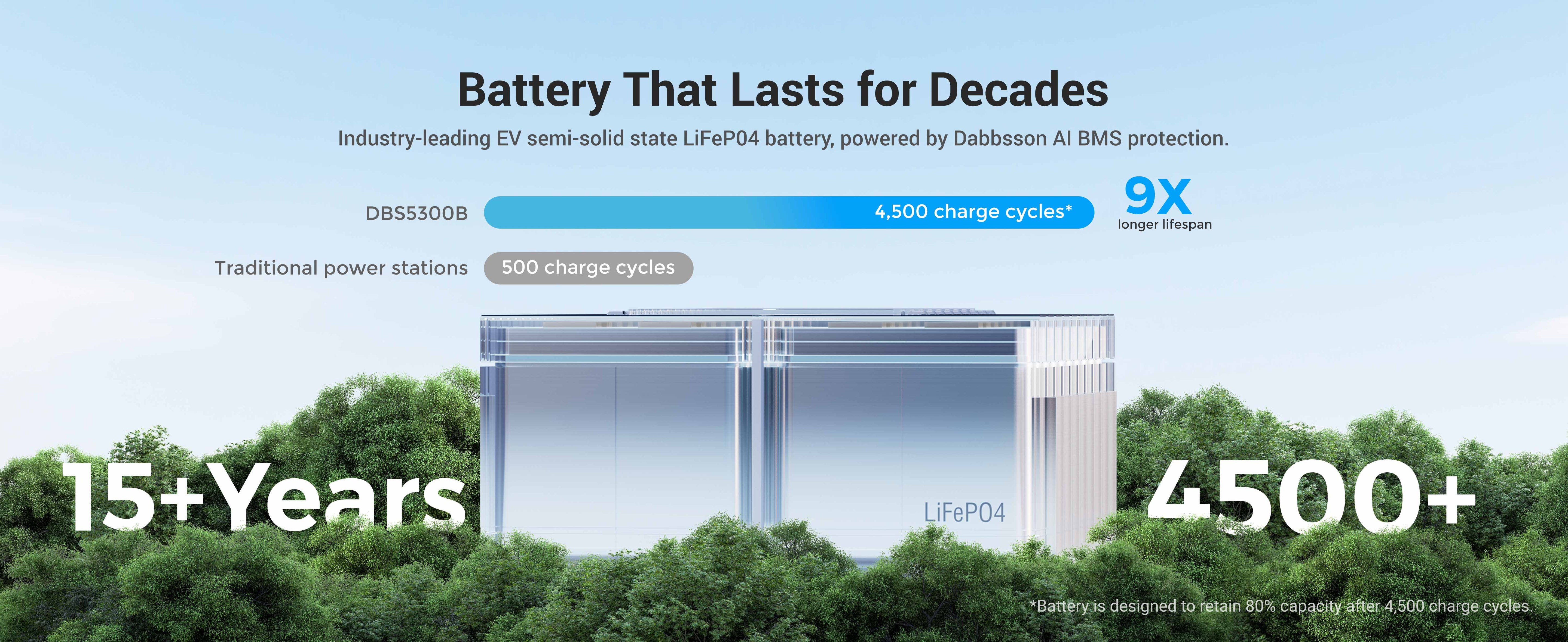 Using EV Semi-solid LiFePO4 battery, DBS5300B is rated to have 4000 + 500 (extra cycles with BMS) before the capacity drop to 80%+ (Tested in lab under 25℃ environment).