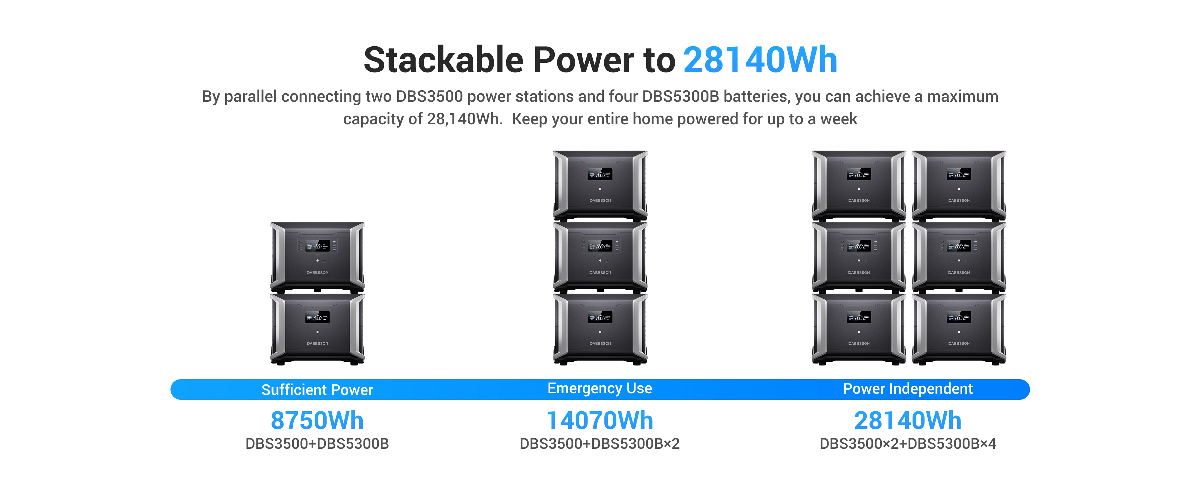 - Increase the capacity of DBS3500 with an maximum extra 10640Wh (DBS5300B × 2)